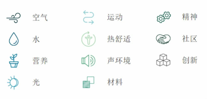 Concept:空氣Air、水Water、營養Nourishment、光線Light、運動Movement、熱舒適Thermal Comfort、聲環境Sound、材料Materials、精神Mind、社區Community、創新Innovations