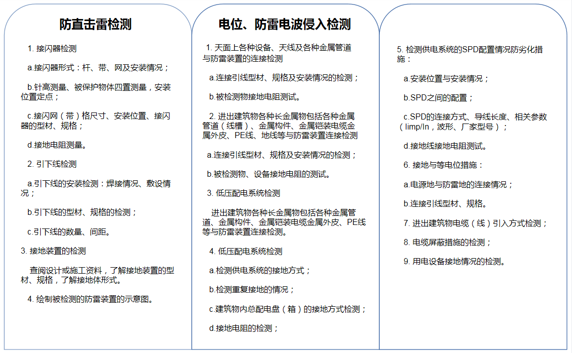 防雷檢測簡單來說為檢測防雷裝置的有效性,防雷裝置檢測順序可按先檢測外部防雷裝置,再檢測內部防雷裝置進行。外部防雷裝置包括接閃器(接閃桿、接閃帶、接閃線、接閃網)、引下線、接地裝置、金屬門窗及屋面大型金屬物體的等電位連接。內部防雷裝置包括各級電涌保護器(SPD)、屋內電子設備的等電位連接、電梯機房的等。